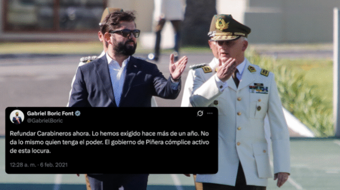 El 6 de febrero de 2021, entonces diputado Gabriel Boric escribió: “Refundar Carabineros ahora. Lo hemos exigido hace más de un año. No da lo mismo quién tenga el poder. El gobierno de Piñera cómplice activo de esta locura”. Un año después, en esa misma fecha, ya era Presidente electo de la República.